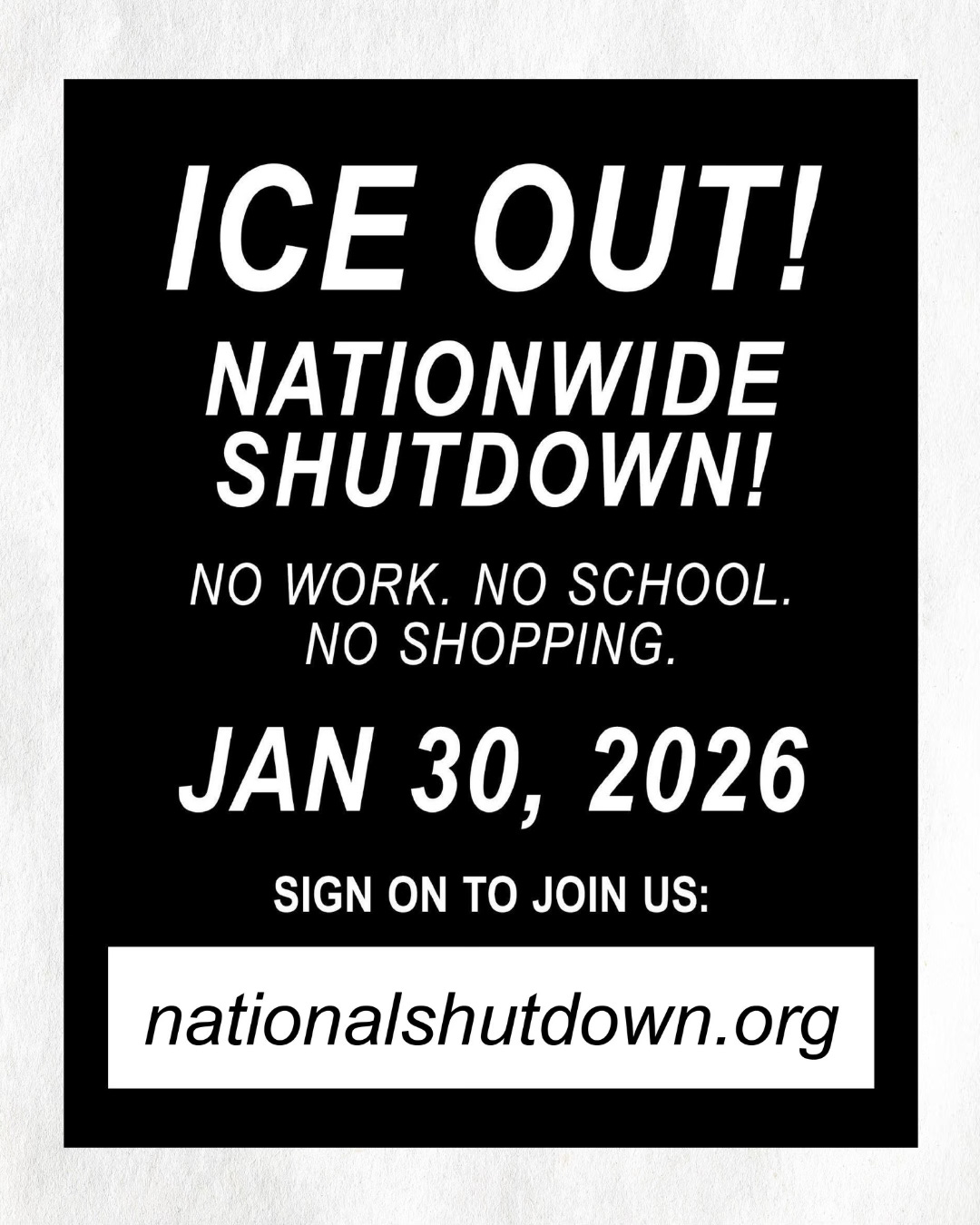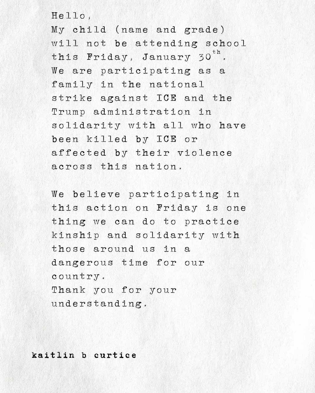 My child (insert name and grade) will not be attending school this Friday, January 30th. We are participating as a family in the national strike against ICE and the Trump administration in solidarity with all who have been killed by ICE or affected by their violence across this nation.